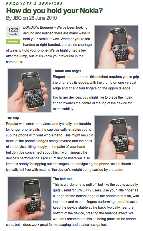 However it’s not all confusion and bad PR, Nokia have jumped aboard the “How do you hold yours?” debacle by releasing this press release.