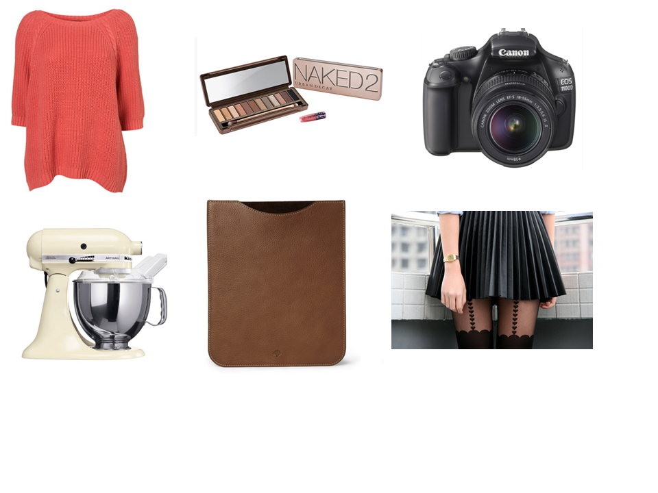 Hopefully with any luck I’ll still be snugly tucked up in bed when this goes live, though knowing kitten I have no chance in reality. Ah well, a girl can dream!Topshop Knitted Chunky Cable T Jumper/Urban Decay Naked 2 palette (currently on offer at Debenhams)/Canon EOS 1100D SLR Camera/Kitchenaid Artisan Mixer/Mulberry iPad sleeve in Oak/H&M Pleated Faux Leather Skirt