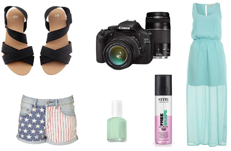 H&M Black Sandals | Canon EOS 550D DSLR | Miss Selfridge Green Maxi Dress | KMS FreeShape Blow Dry Spray | Essie Mint Candy Apple | Topshop American Flag Shorts