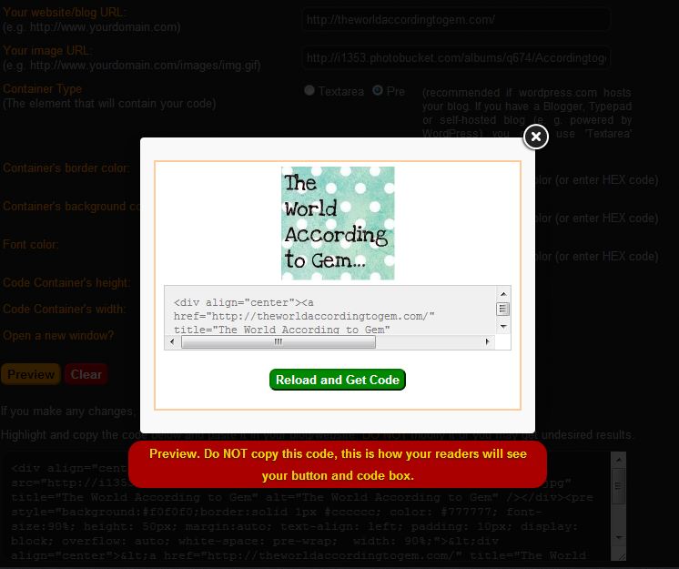 If you’re happy with what you see click Reload and Get Code. This will generate a neat little code.