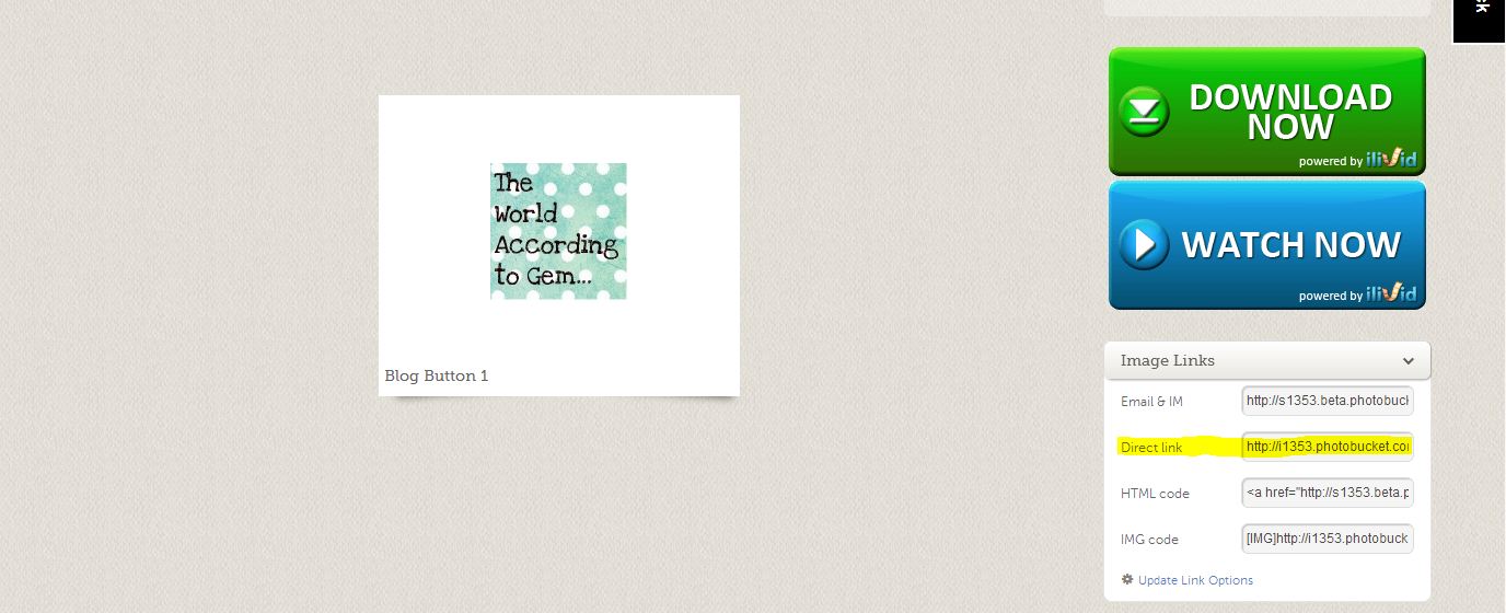 The link should look something like this – http://i1353.photobucket.com/albums/q674/Accordingtogem/blogbutton.jpg