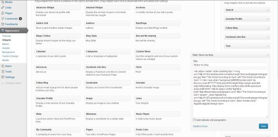 Copy this code and head back to your blog dashboard. Click on Appearance then Widgets and choose Text widget. Drag this to your side bar and insert your copied code, don’t forget to click Save.